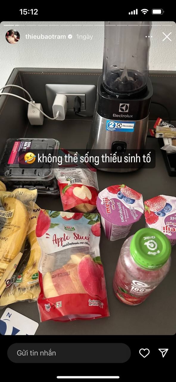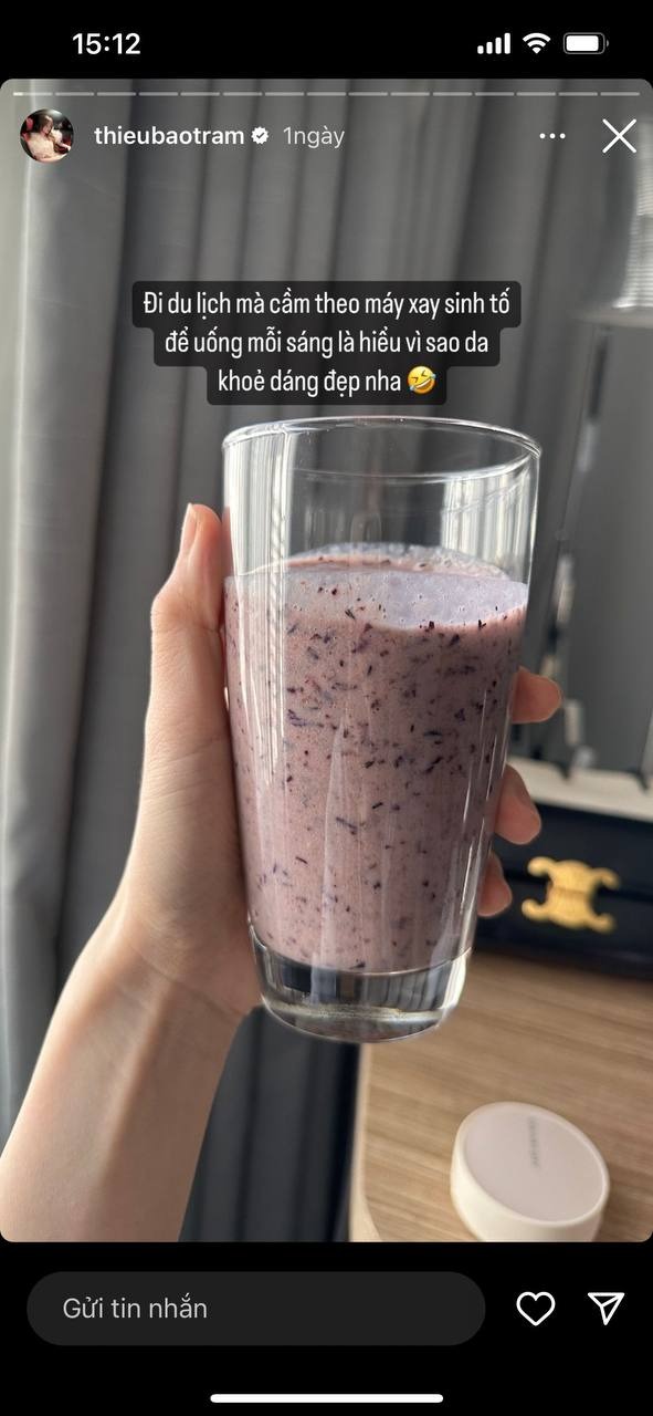 Trên trang cá nhân, Thiều Bảo Trâm thường xuyên chia sẻ những hình ảnh bản thân tập luyện để giữ dáng. Mới đây, cô còn công khai 1 thứ bản thân "không thể sống thiếu" đó là sinh tố. Theo nữ ca sĩ chia sẻ, cô thậm chí còn mang cả máy xay sinh tố đi du lịch để uống mỗi sáng, đó là bí quyết để Thiều Bảo Trâm có da khỏe, dáng đẹp.