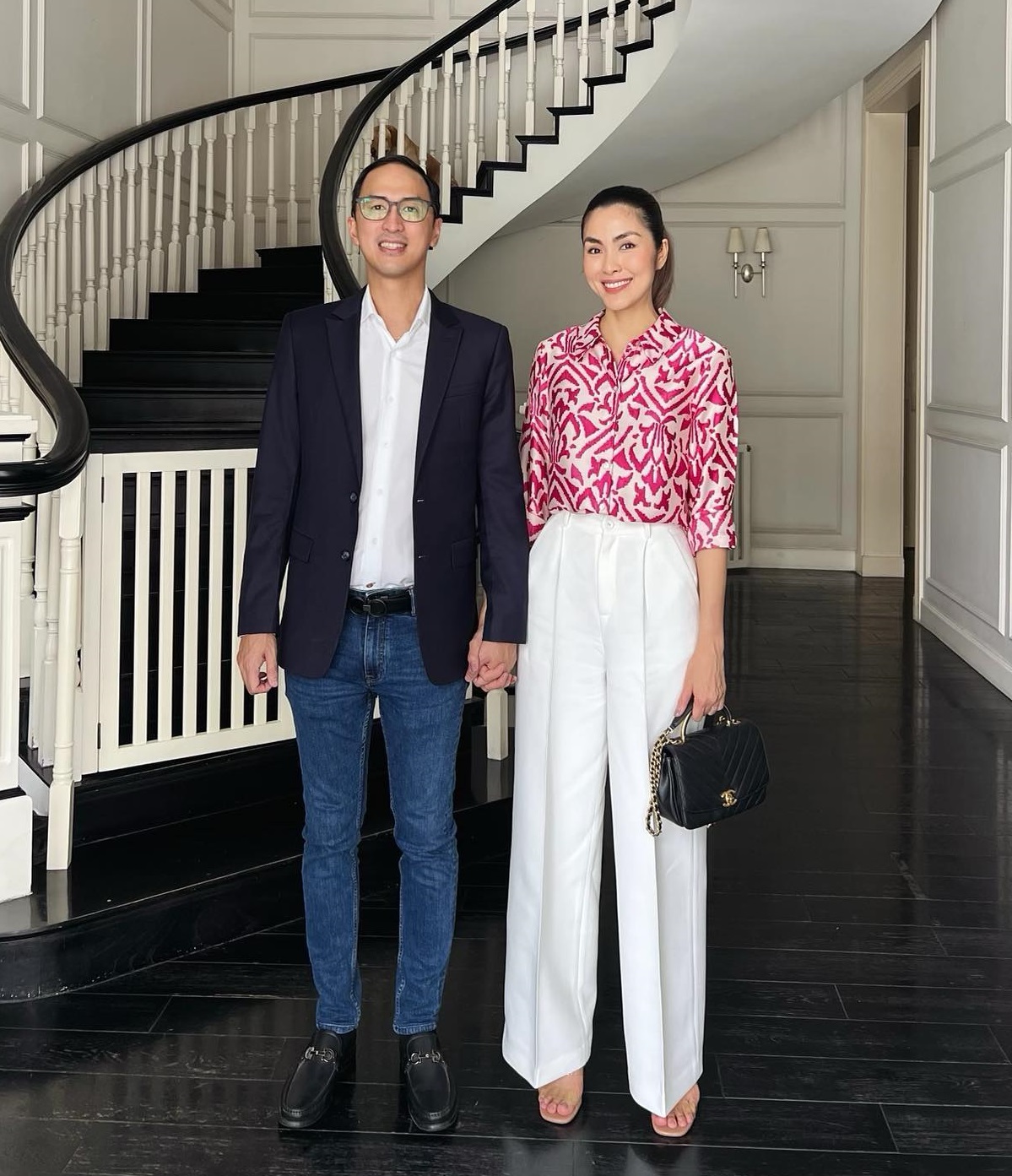 Tăng Thanh Hà lên đồ đúng chất công sở với combo áo sơ mi kết hợp với quần âu. Tuy nhiên, nhờ chọn áo họa tiết tông màu hồng làm chủ đạo, vẻ ngoài của Hà Tăng có sự nổi bật, tươi tắn. Louis Nguyễn cũng áp dụng phong cách thanh lịch, rất đồng điệu với bà xã. Anh chọn diện sơ mi trắng, áo vest và kết hợp với quần jeans để tạo nên bộ trang phục lịch sự mà vẫn trẻ trung.