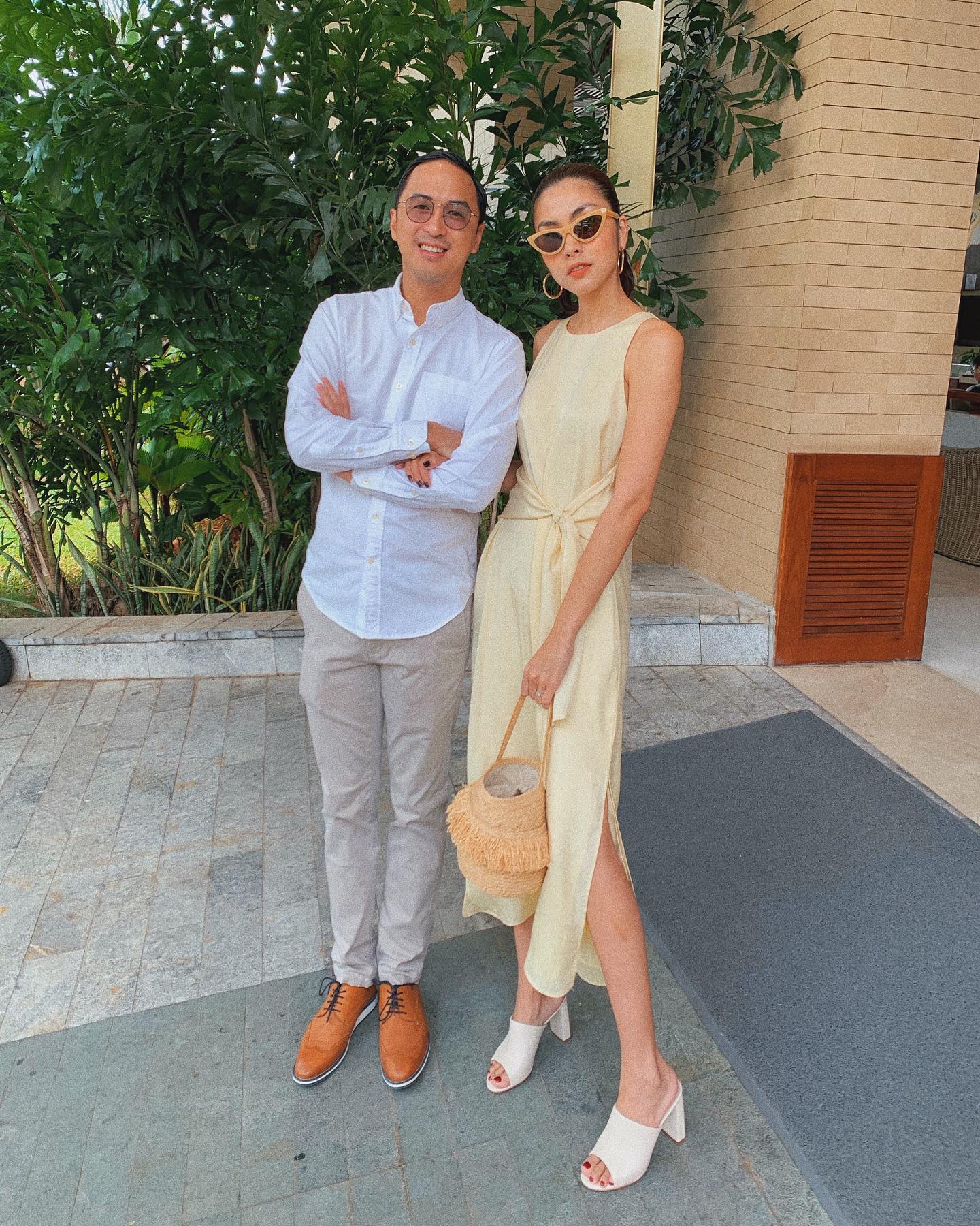 Kết hợp áo sơ mi trắng với quần màu xám nhạt, đi giày da, Louis Nguyễn có được vẻ ngoài trẻ trung, lịch lãm. Hà Tăng chọn diện mẫu váy vàng nhạt, có chi tiết nhấn eo rất trẻ trung và trendy. Tổng thể trang phục được nâng tầm nhờ đôi khuyên tai tròn và giày mule sành điệu.