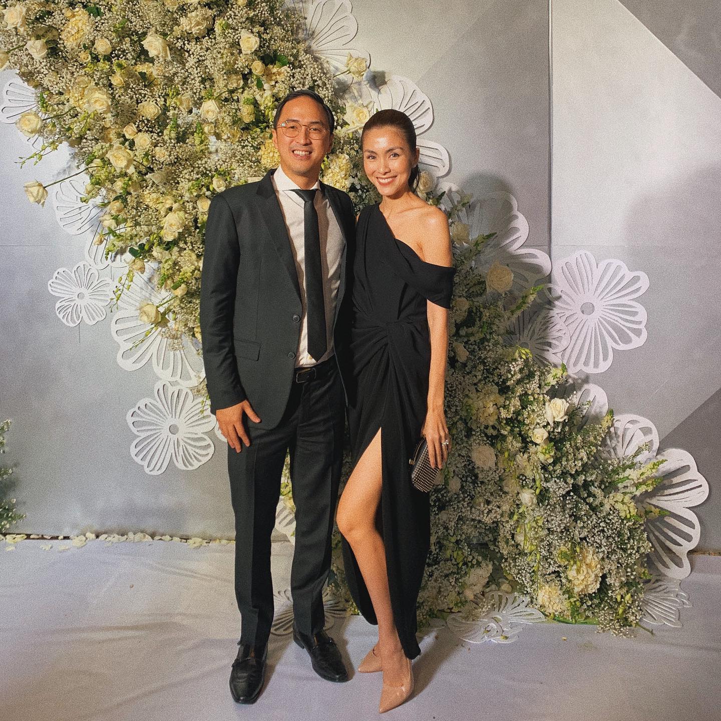 Không cần cầu kỳ, Tăng Thanh Hà gây ấn tượng ở sự sang trọng, quý phái khi diện váy đen trễ vai, kết hợp với giày cao gót mũi nhọn thanh lịch. Chi tiết váy xẻ tà cho hiệu quả tôn dáng tối ưu. Trang phục của cô tông xuyệt tông với bộ suit lịch lãm mà doanh nhân Louis Nguyễn đang diện.