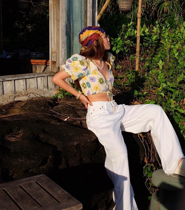 Chị em đừng bỏ qua những chiếc áo họa tiết hoa khi đi du lịch. Yến Trang đã kết hợp mẫu áo dáng lửng với quần trắng để vẻ ngoài thêm tươi tắn, mà không bị rối mắt. Những món phụ kiện như vòng cổ ngọc trai, khăn đội đầu giúp tổng thể càng thêm cuốn hút.