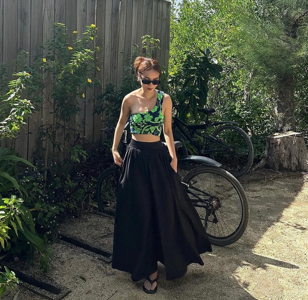 Kết hợp áo dáng lửng họa tiết hoa với chân váy dài, Yến Trang có được bộ trang phục hoàn hảo để đi biển. Các món phụ kiện như dây chuyền, kính mắt đã giúp tổng thể set đồ thêm long lanh, nổi bật.
