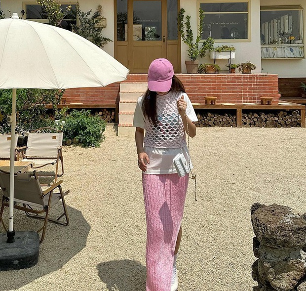 Áo đan móc là một trong những món thời trang đặc trưng của phong cách đi du lịch. Yến Trang đã kết hợp mẫu áo này cùng chân váy denim, để tạo nên bộ đồ nữ tính, mà không kém phần thời thượng. Set trang phục của Yến Trang còn rất ăn ảnh, chị em nên tham khảo.