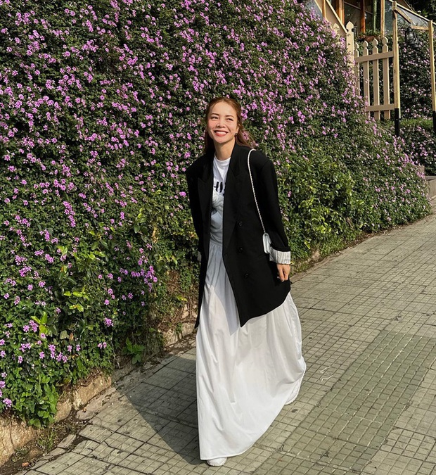 Đi du lịch tại Đà Lạt, Yến Trang diện bộ trang phục phù hợp với thời tiết se lạnh gồm áo thun, chân váy trắng và blazer dáng rộng khoác ngoài. Set đồ này vừa có sự trẻ trung, thời thượng, vừa ghi điểm thanh lịch. Yến Trang còn chọn kiểu tóc buộc nửa rất nữ tính và yêu kiều để vẻ ngoài thêm nổi bật.