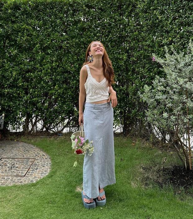 Yến Trang toát lên vẻ xinh tươi và ngọt ngào khi diện áo hai dây trắng kết hợp với chân váy họa tiết gingham. Không chỉ ghi điểm trẻ trung, outfit của Yến Trang còn cho hiệu quả tôn dáng tốt. Với các set đồ du lịch, chị em không cần chọn giày dép quá đứng dáng. Một đôi dép xỏ ngón sẽ giúp bạn hoàn thiện bộ trang phục phóng khoáng và sành điệu.