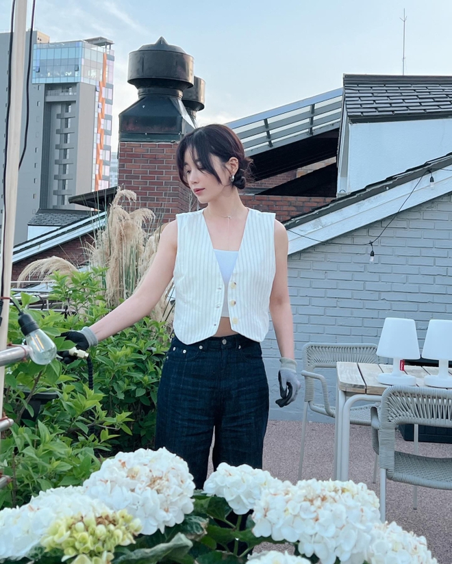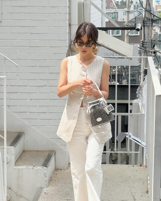 Áo gile đang là xu hướng nổi bật trong mùa hè. Ki Eun Se có cách diện item này rất trẻ trung, đó là ưu tiên áo gile kẻ sọc màu trắng, rồi kết hợp với quần xuyệt tông. Outfit trên tạo cảm giác dễ chịu, mát mắt và còn ghi điểm ở sự tinh tế. Ki Eun Se tô điểm trang sức vàng để nâng tầm vẻ sang trọng cho bộ cánh.