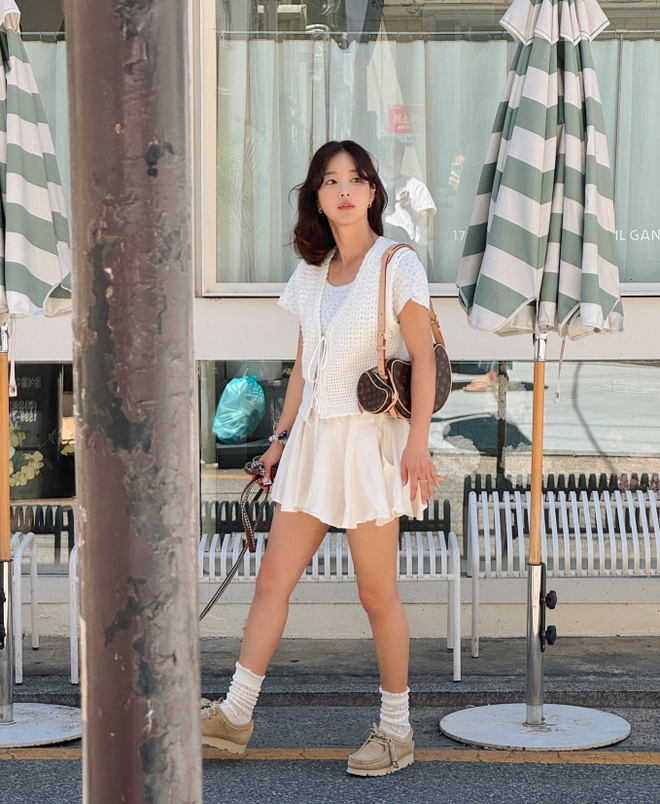 Những chiếc áo đan lưới rất phù hợp với các chuyến du lịch mùa hè và khi dạo phố cuối tuần. Mẫu áo họa tiết hoa 3D của Ki Eun Se vốn nổi bật nên cô chỉ kết hợp với chân váy ngắn màu be, vẻ ngoài đã ấn tượng và còn có sự hài hòa. Đôi dép lê màu trắng ăn nhập hoàn hảo với bộ đồ trang nhã.
