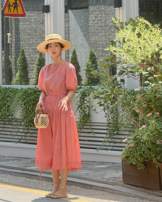 Váy vải thô là lựa chọn hoàn hảo cho mùa hè nóng bức vì độ nhẹ mát, thoải mái khi diện. Thay vì chọn váy mang tông màu trung tính, quý cô trên 40 tuổi hãy "tô màu" cho phong cách với phiên bản màu hồng pastel. Đôi giày ánh kim đã tăng thêm nét long lanh cho tổng thể bộ váy.