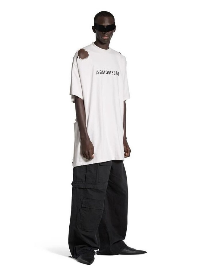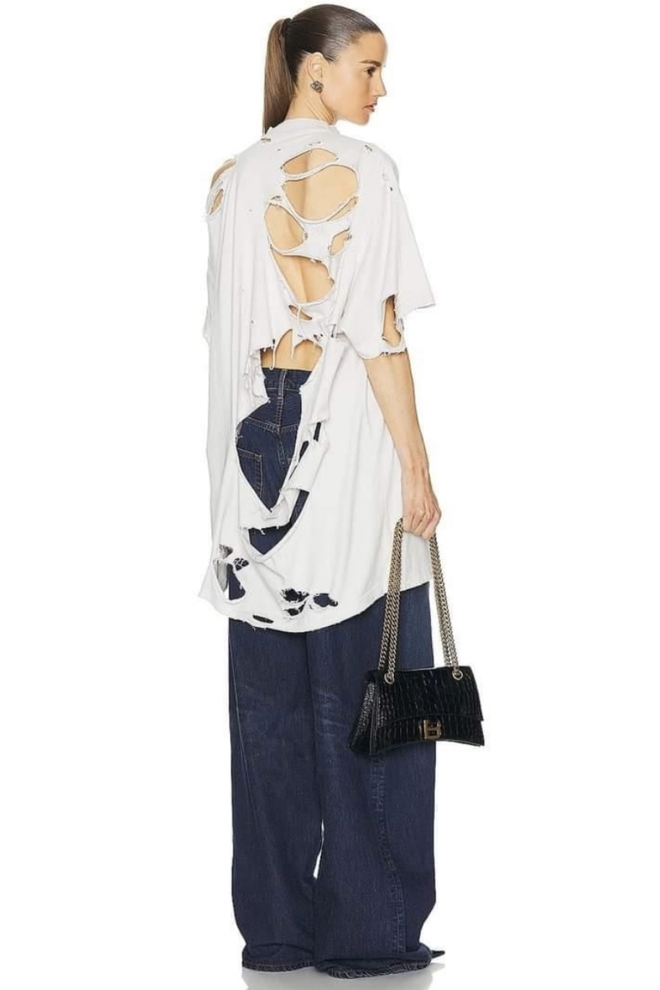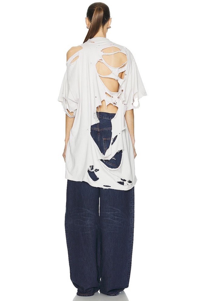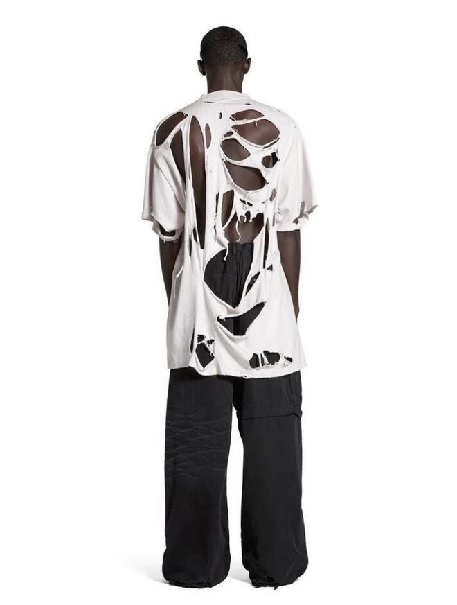 Nhân vật chính của câu chuyện chính là mẫu áo phông oversized trơn màu trắng với điểm nhấn chính là loạt vết rách chi chít. Đáng chú ý, mẫu thiết kế “thiếu vải” này có giá lên đến 993 USD, xấp xỉ… 25 triệu VNĐ.
