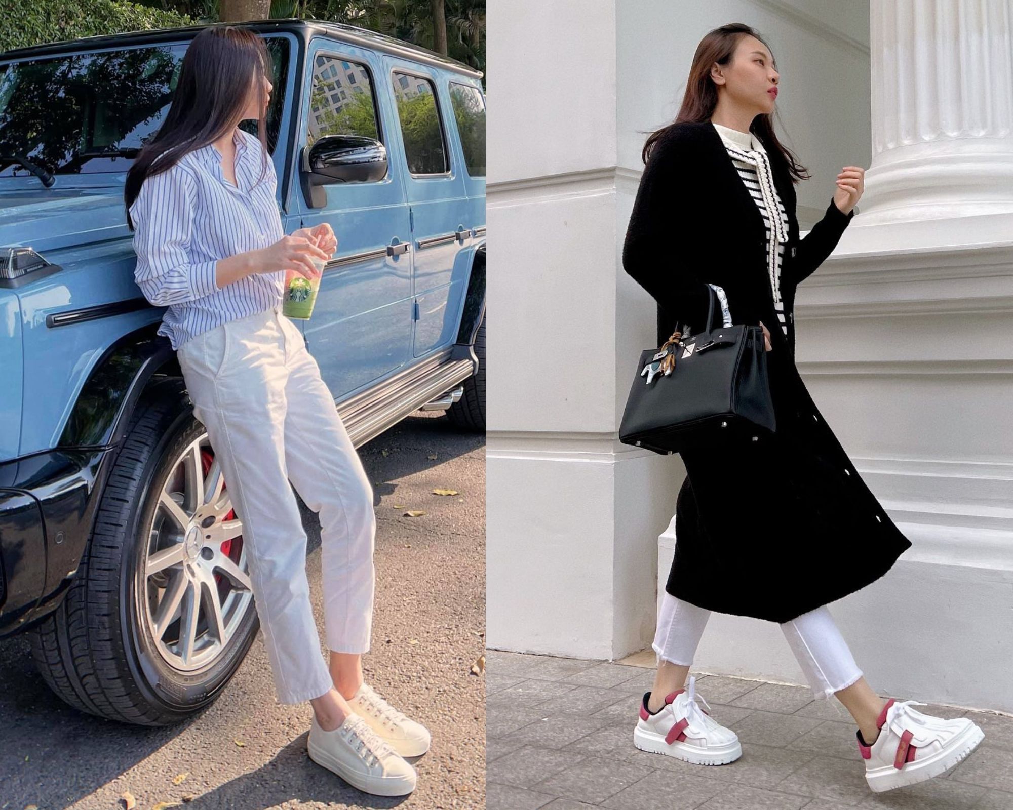 Nếu thường xuyên đi giày bệt, tủ đồ của chị em nên có một vài chiếc quần ống đứng. Thiết kế quần ống đứng, dài trên mắt cá chân sẽ tạo hiệu ứng cao ráo cho vóc dáng, đồng thời giúp vẻ ngoài thêm gọn gàng, chỉn chu. Đàm Thu Trang kết hợp quần ống đứng với áo sơ mi, giày sneaker trắng để tạo nên set trang phục thanh lịch, thời thượng. Sang đến mùa lạnh, nếu kết hợp quần ống đứng với áo khoác dáng dài, chị em sẽ không lo bị "dìm" chiều cao.