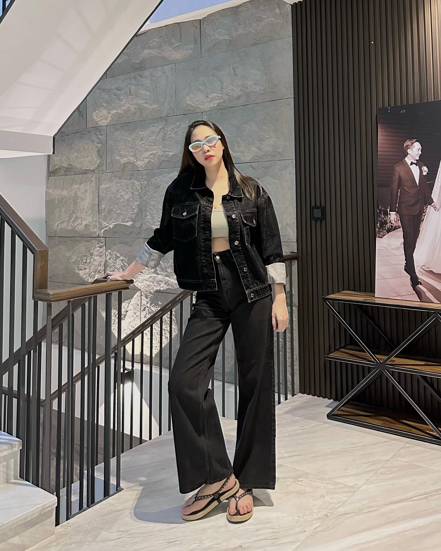 Để tạo sự phá cách cho style, Đàm Thu Trang không bỏ qua áo crop top khi hoàn thiện phong cách. Ưu điểm của crop top là sự nổi bật và quyến rũ. Ngoài ra, kiểu áo này còn giúp tôn dáng tối ưu. Nhờ kết hợp áo crop top với quần jeans cạp cao và áo khoác denim, Đàm Thu Trang đã hoàn thiện được bộ trang phục bụi bặm, hợp mốt nhưng không kém phần tinh tế.
