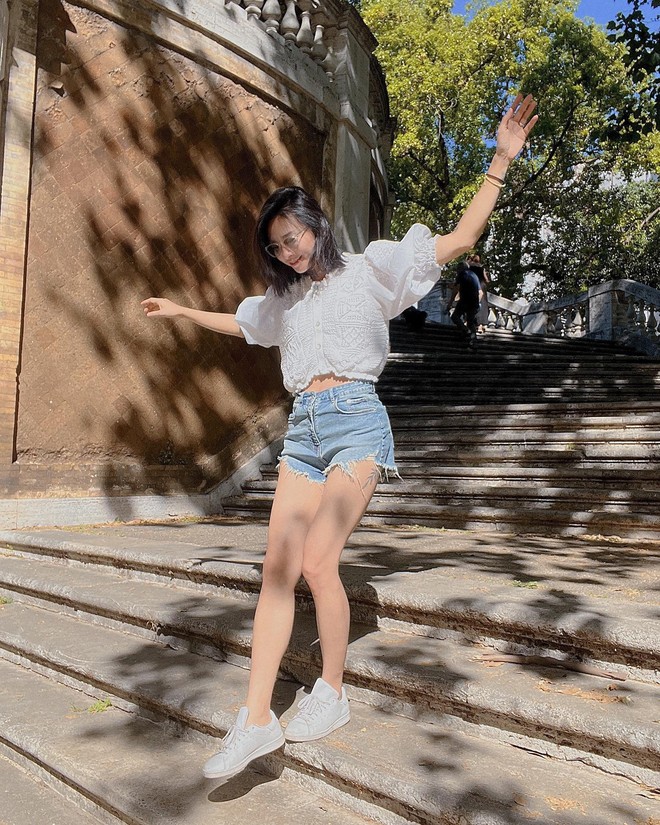 Ngô Thanh Vân thường kết hợp quần short với áo thun trắng, áo crop top hoặc áo blouse nữ tính, ngọt ngào. Các công thức này nhân đôi hiệu quả "hack" tuổi, nhưng vẫn có sự hài hòa, trang nhã. Để hoàn thiện outfit, Ngô Thanh Vân sẽ đi giày sneaker trắng sành điệu.