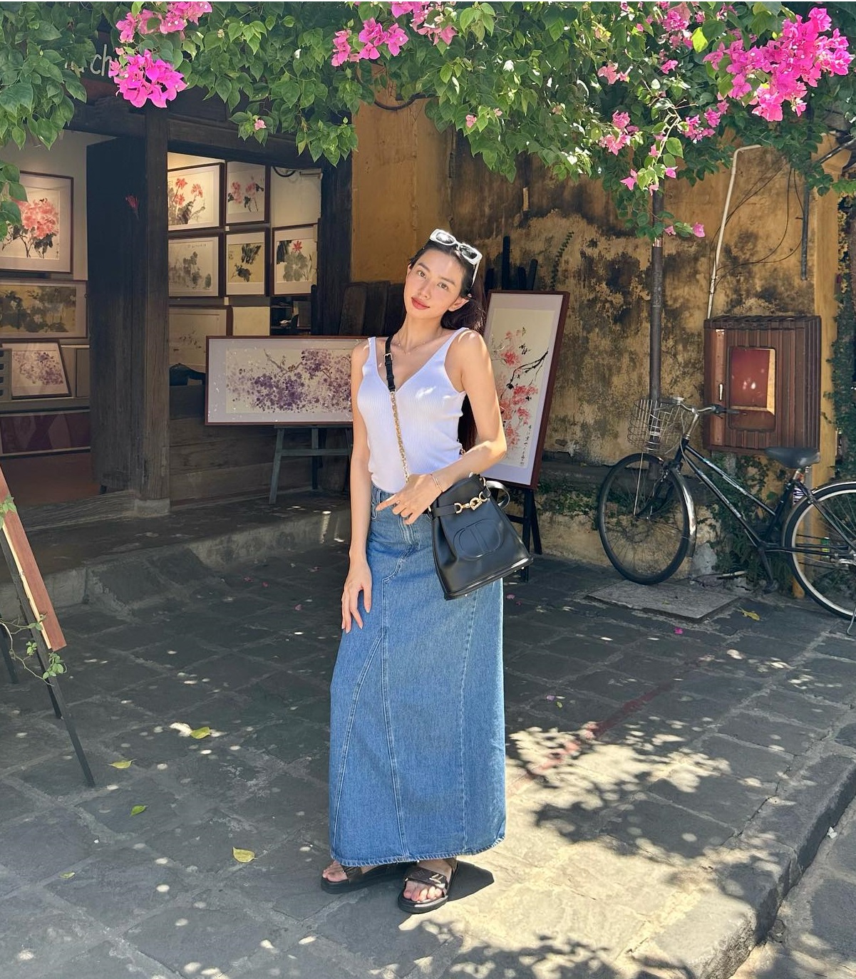 Combo áo hai dây màu đen và quần xanh denim không quá cầu kỳ nhưng vẫn rất ấn tượng. Công thức này ghi điểm ở sự cá tính, trẻ trung. Các mẫu giày phù hợp với outfit trên bao gồm sandal đế thô, sneaker trắng hoặc dép lê phóng khoáng.