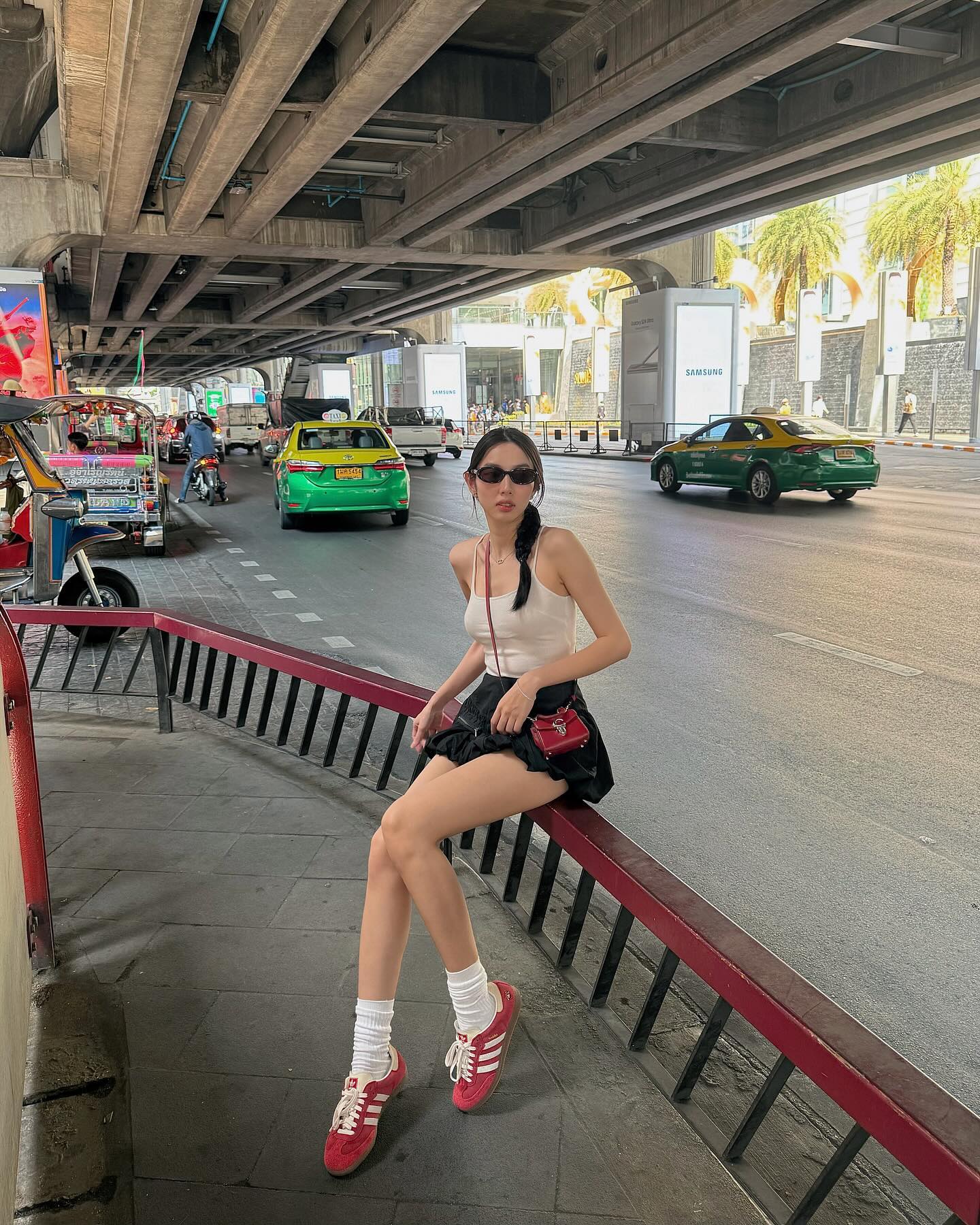 Thùy Tiên gợi ý set áo hai dây rất nữ tính, ngọt ngào. Cô đã kết hợp áo hai dây trắng cùng chân váy ngắn dáng xòe và đi giày sneaker đỏ nổi bật. Công thức trang phục này sẽ "hack" chiều cao tối ưu ngay cả khi các nàng đi giày bệt. Bộ đồ trên còn rất ăn ảnh, các nàng nên áp dụng trong những chuyến du lịch.