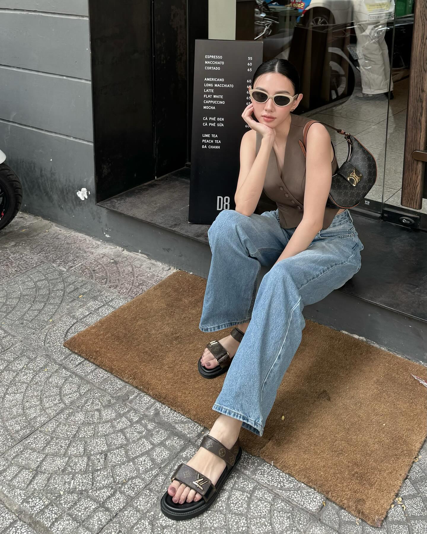 Áo gile đang là xu hướng thời trang phổ biến. Món đồ này ghi điểm ở sự thanh lịch, sang trọng. Khi kết hợp áo gile với quần jeans xanh, vẻ ngoài của người diện thêm trẻ trung, bụi bặm. Thay vì diện các mẫu giày đứng dáng, Thùy Tiên đã đi sandal đế thô để tạo nên sự cá tính, nổi bật cho outfit.