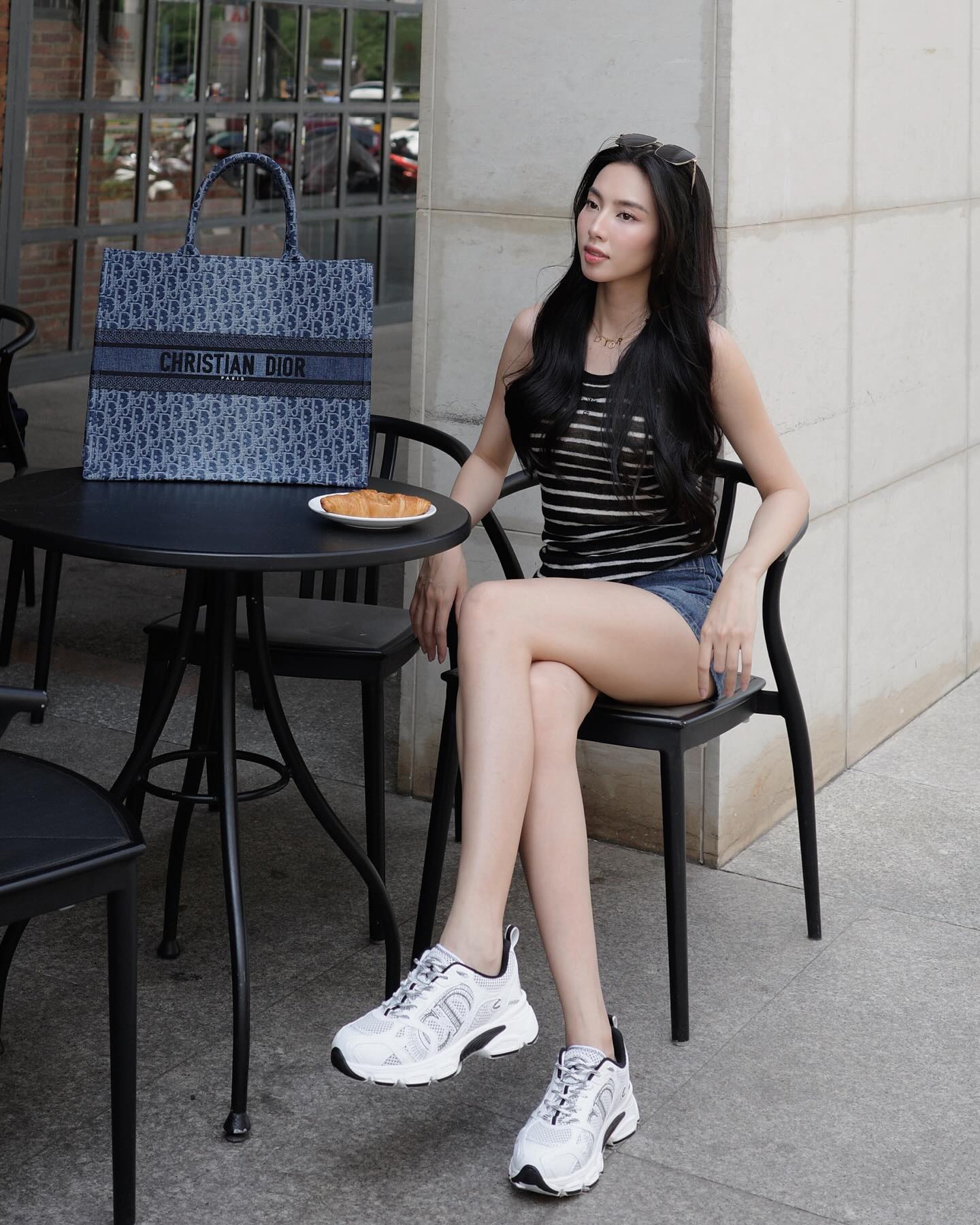 Áo hai dây kẻ ngang có sự nổi bật, trẻ trung. Mẫu áo này kết hợp ăn ý với quần denim short để tạo nên bộ đồ dạo phố chuẩn sành điệu. Đôi giày sneaker trắng ăn nhập hoàn hảo với bộ trang phục năng động.
