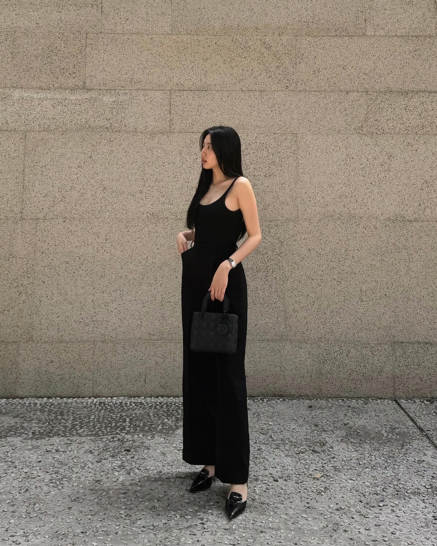 Thùy Tiên diện áo hai dây theo cách tối giản, đó là kết hợp áo trơn màu đen với quần ống suông xuyệt tông. Thao tác sơ vin và đôi giày mũi nhọn đã tăng thêm nét sang chảnh cho bộ đồ. Khi áp dụng set đồ tối giản này, chị em có thể tô điểm trang sức vàng để giúp outfit thêm long lanh mà không làm giảm đi sự tinh tế.