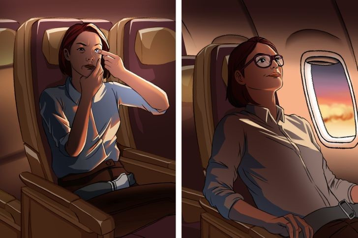 Không khí trên máy bay khác với không khí ở mặt đất. Trên máy bay, độ ẩm thấp, không khí khô có thể gây khó chịu cho mắt, đặc biệt là đối với những người đeo kính áp tròng. Vì lý do này, hành khách nên đeo kính thường thay vì kính áp tròng.