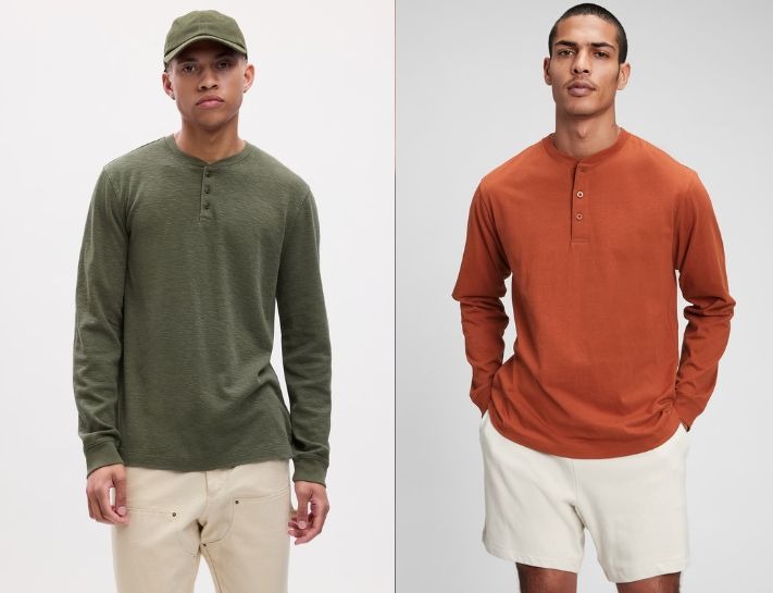 Áo Henley tay dài: Áo Henley tay dài phù hợp với mùa đông, thiết kế phần cánh tay áo dài chạm cổ tay, chất liệu mềm mại và thoáng mát. Item này có thể phối với quần tây, quần kaki hay một vài kiểu quần jeans.