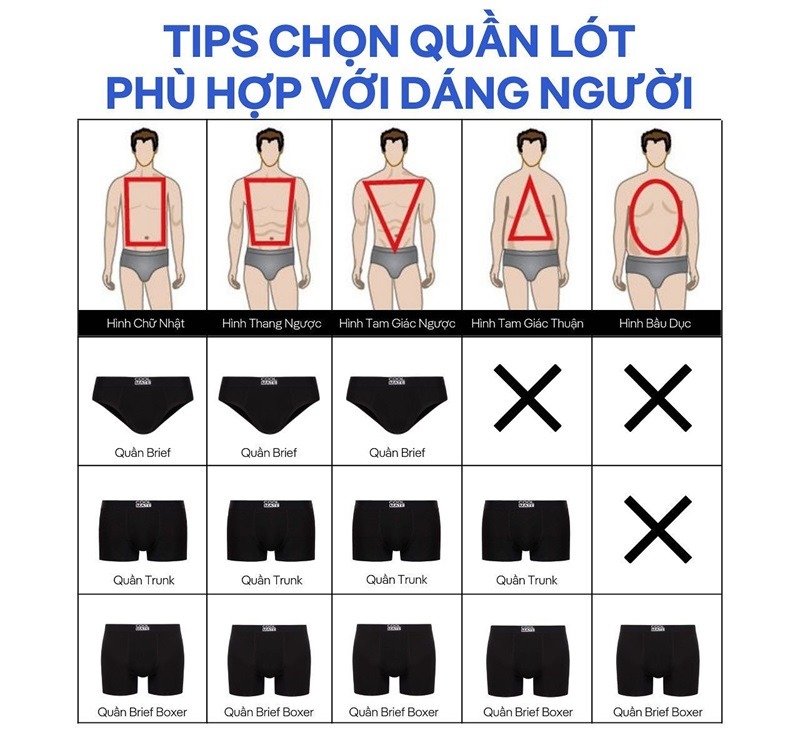 -Dáng người hình tam giác: Với những người có phần thân trên rộng hơn phần thân dưới, quần lót nam briefs giúp cân bằng vóc dáng và tạo sự hài hòa cho cơ thể.