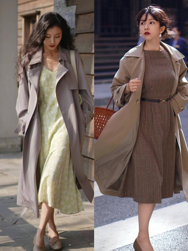 Công thức lý tưởng cho các nàng bánh bèo khi diện trench coat đó là mix cùng váy liền hoặc chân váy midi. Những chiếc váy thướt tha mang đến cho set đồ với áo trench coat vẻ mềm mại, dịu dàng và rất nữ tính. Để set đồ hack tuổi, bạn đừng ngại chọn kiểu váy họa tiết xinh tươi hay chân váy màu sắc tươi sáng đầy bắt mắt nhé.