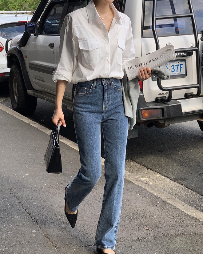 Sự kết hợp giữa áo sơ mi trắng và quần jeans xanh sẽ mang đến cho người diện nét thanh lịch, xen lẫn vẻ bụi bặm, cá tính. Dù khá đơn giản, công thức này vẫn giúp người mặc có được vẻ ngoài nổi bật. Chị em nên chú trọng tới khoản "hack" dáng khi diện áo sơ mi và quần jeans xanh. Tuyệt chiêu ở đây chính là lựa chọn quần jeans ống đứng dài trên mắt cá chân, quần jeans ống vẩy hoặc quần skinny jeans.