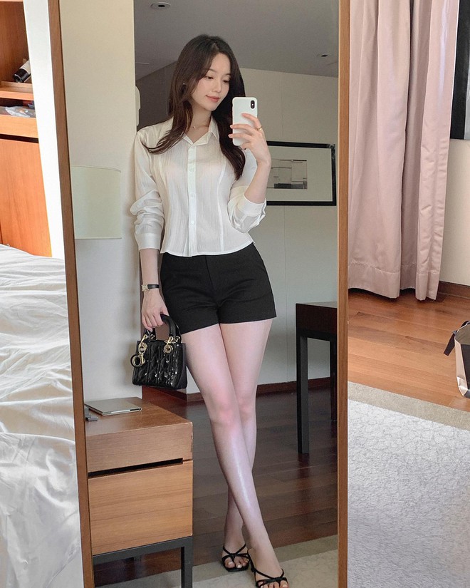 Các quý cô sành điệu thường kết hợp quần denim short với áo sơ mi trắng. Công thức này tươi mới, "hack" tuổi hiệu quả, phù hợp để mặc khi dạo phố hoặc đi du lịch. Nếu diện quần short đứng dáng, có đường ly giữa với áo sơ mi trắng, các nàng sẽ có được bộ trang phục thanh lịch, sang trọng, có thể mặc đi đám cưới hoặc dự sự kiện.
