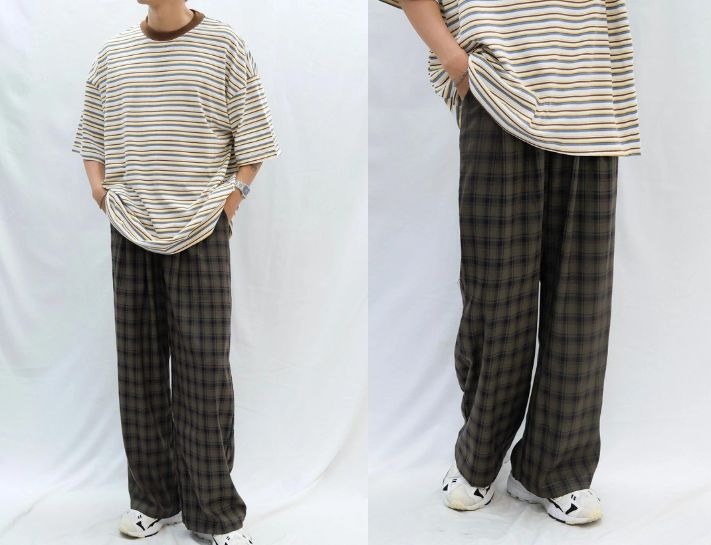 Phối quần caro ống rộng nam với áo thun