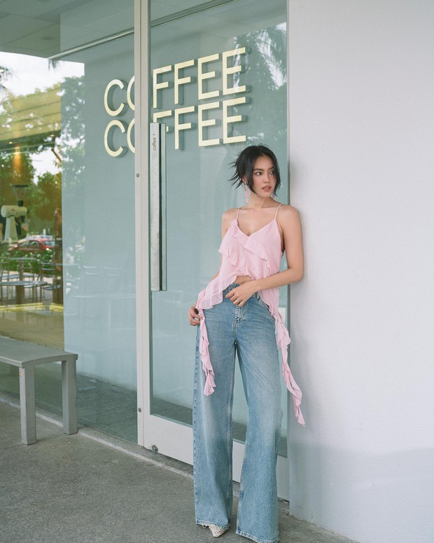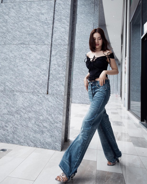 Ninh Dương Lan Ngọc gợi ý thêm một cách diện quần jeans đầy quyến rũ, đó là công thức áo trễ vai kết hợp với quần denim ống rộng. Với mẫu quần dài qua mắt cá chân, Ninh Dương Lan Ngọc đã khéo léo đi sandal cao gót để kéo chân dài miên man.