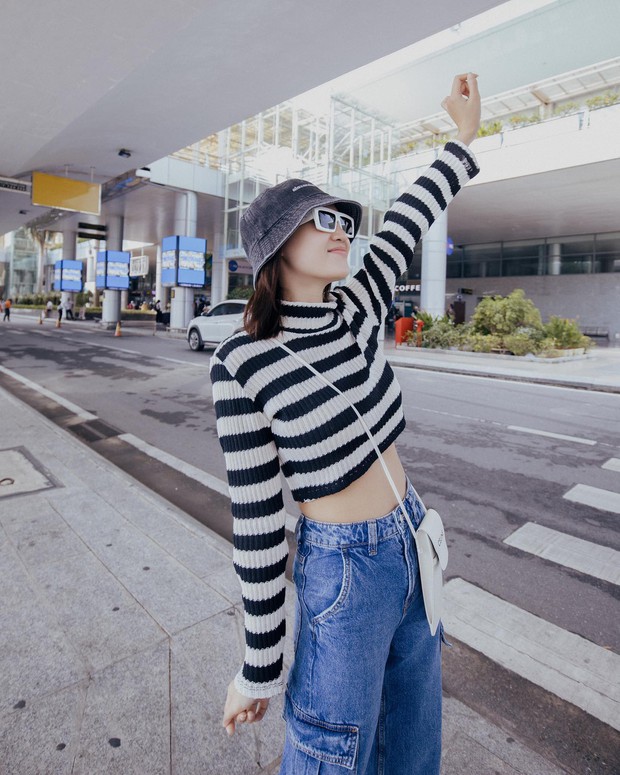 Kết hợp áo kẻ ngang với quần jeans túi hộp, quý cô U40 sẽ có vẻ ngoài trẻ trung, nổi bật trong tích tắc. Ninh Dương Lan Ngọc đã tăng vẻ ngọt ngào cho phong cách khi tô điểm một chiếc mũ bucket.