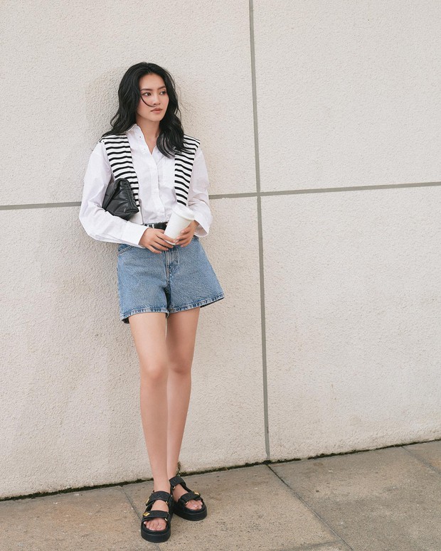 Công thức áo thun trắng và quần denim short rất đơn giản nhưng không tạo cảm giác nhàm chán. Khi tô điểm áo len quàng vai, đi sandal đế thô, bộ trang phục của Ninh Dương Lan Ngọc trở nên ấn tượng, tươi mới hơn.