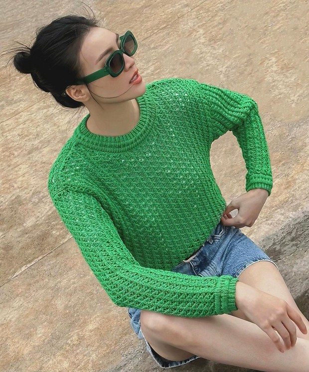 Bên cạnh quần jeans, Ninh Dương Lan Ngọc còn biến hóa phong cách với quần denim short. Sự kết hợp giữa áo len tông màu xanh lá và quần denim short đã tạo nên bộ trang phục nổi bật nhưng vẫn có nét hài hòa. Vẻ ngoài của người diện thêm "cool ngầu" nhờ thắt lưng da và kính mắt.