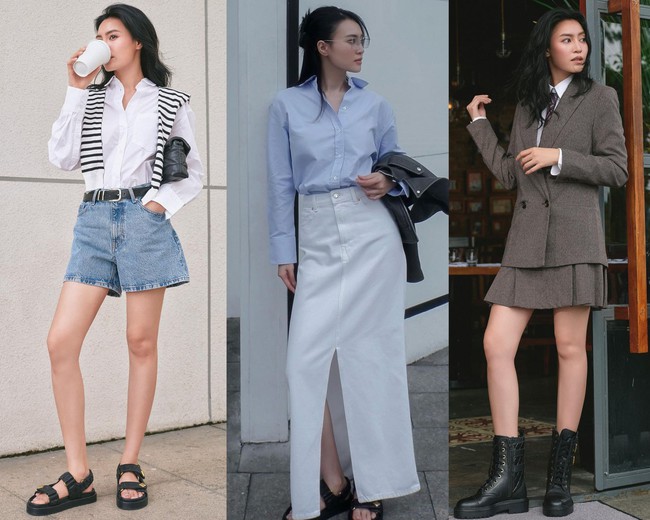 Áo sơ mi là "chìa khóa" cho vẻ ngoài thanh lịch, trang nhã. Và thay vì chọn áo sơ mi mang tông màu trầm, Ninh Dương Lan Ngọc ưu tiên phiên bản sáng màu hơn, chẳng hạn như sơ mi trắng hay sơ mi xanh pastel. Các mẫu sơ mi này sẽ giúp vẻ ngoài của người mặc thêm rạng rỡ và tươi tắn. Và khi phối áo sơ mi màu tươi sáng với quần denim short, chân váy dài hoặc áo blazer…, vẻ ngoài của Ninh Dương Lan Ngọc vẫn có được sự thanh lịch.