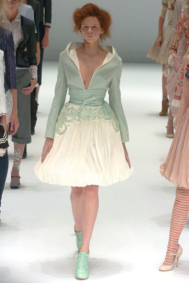 Alexander McQueen trình làng những trang phục mang cảm hứng từ nhiều nơi trên thế giới trong BST Xuân Hè 2005. Từ những chi tiết thêu và ren lưới của phong cách Edwardian, áo kimono Nhật Bản, bóng bầu dục Mỹ,...