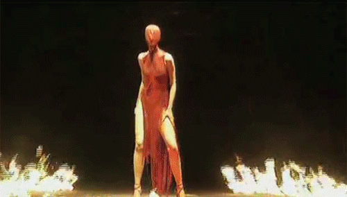 Kết show, McQueen làm khán giả phải wow với một mẫu thiết kế làm bằng ren đỏ che kín mặt người mẫu. Khoảnh khắc gấy bất ngờ nhất là khi model đi đến cuối sàn diễn, đứng giữa vòng tròn lửa như đang tái hiện lại chính ảnh Joan of Arc bị đưa lên giàn thiêu. Bộ trang phục màu đỏ "rực máu" kín bưng cộng với không khí u ám, đen tối cùng nhạc nền kịch tính càng khiến cho show diễn có thêm phần sinh động đến trần trụi.