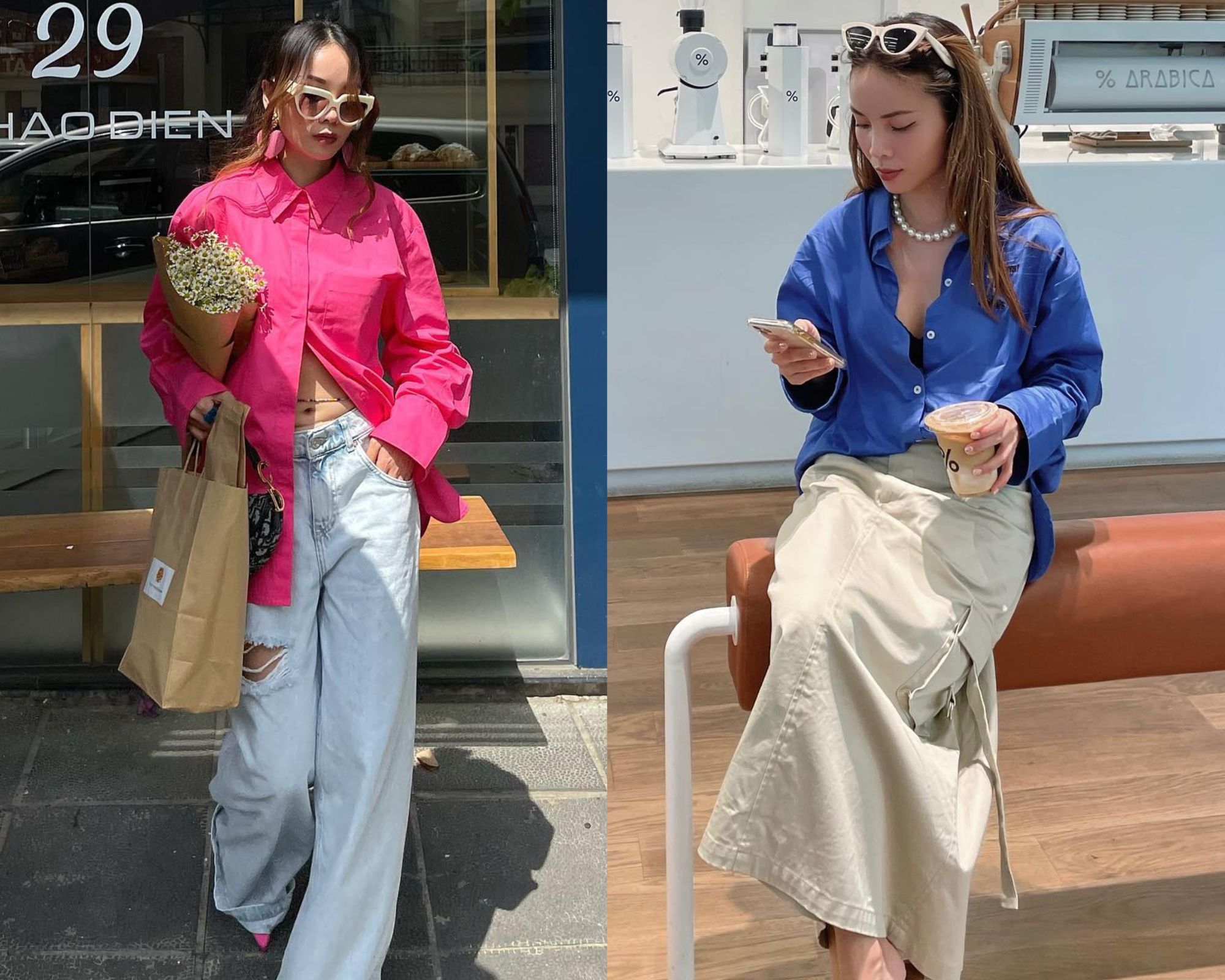 Thay vì chỉ giới hạn phong cách trong những chiếc áo sơ mi màu trung tính nhã nhặn, Yến Trang lại xây dựng style theo một hướng khác. Cô rất ưa chuộng áo sơ mi tông màu đậm, sắc độ rực rỡ. Lựa chọn này giúp vẻ ngoài của Yến Trang luôn nổi bật và trông trẻ trung hơn nhiều so với tuổi. Với áo sơ mi màu sắc, Yến Trang thường kết hợp cùng quần jeans hoặc chân váy màu trung tính để tạo sự hài hòa, sang trọng cho bộ trang phục. Đôi khi, cô còn tăng độ ấn tượng cho tổng thể outfit với các món phụ kiện như vòng cổ ngọc trai, khuyên tai nổi bật.