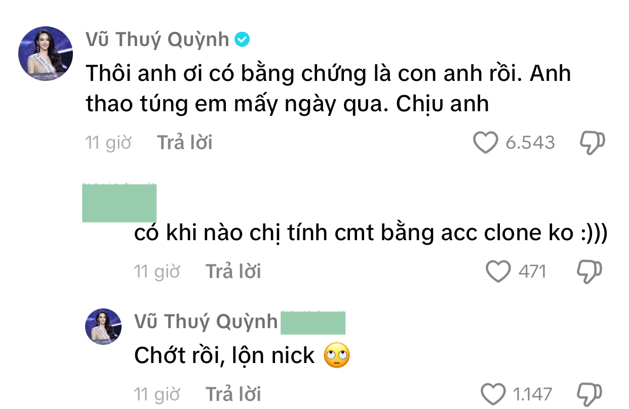 Tưởng chừng phát ngôn đính chính này sẽ giúp xoa dịu dư luận, thế nhưng tình hình có vẻ ngày càng "căng thẳng" hơn khi nhiều cư dân mạng liên tục bình luận trái chiều. Ngay bên dưới đoạn clip của ViruSs, cư dân mạng còn phát hiện một bình luận đến từ tài khoản chính chủ của Á hậu Vũ Thuý Quỳnh với nội dung: "Thôi anh ơi, có bằng chứng là con anh rồi. Anh thao túng em mấy ngày qua. Chịu anh".