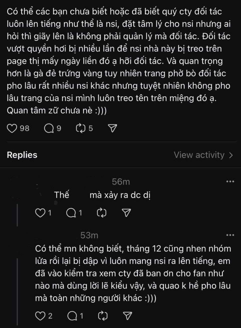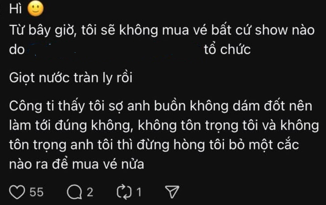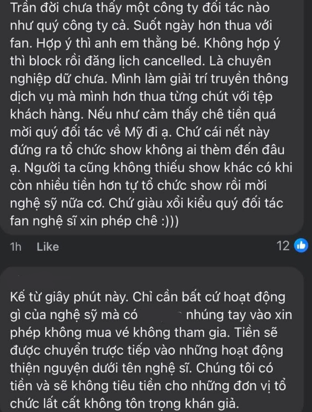 Khi bị fan thắc mắc về cách làm việc khó hiểu, V liền đáp trả từng bình luận, thậm chí có thái độ thách thức. Nếu fan nêu lên quan điểm không đúng ý, V liền block (chặn) thằng tay. Thay vì nói chuyện hay xử lý thì công ty này quyết định hủy show để chứng tỏ uy quyền, lời nói có trọng lượng.