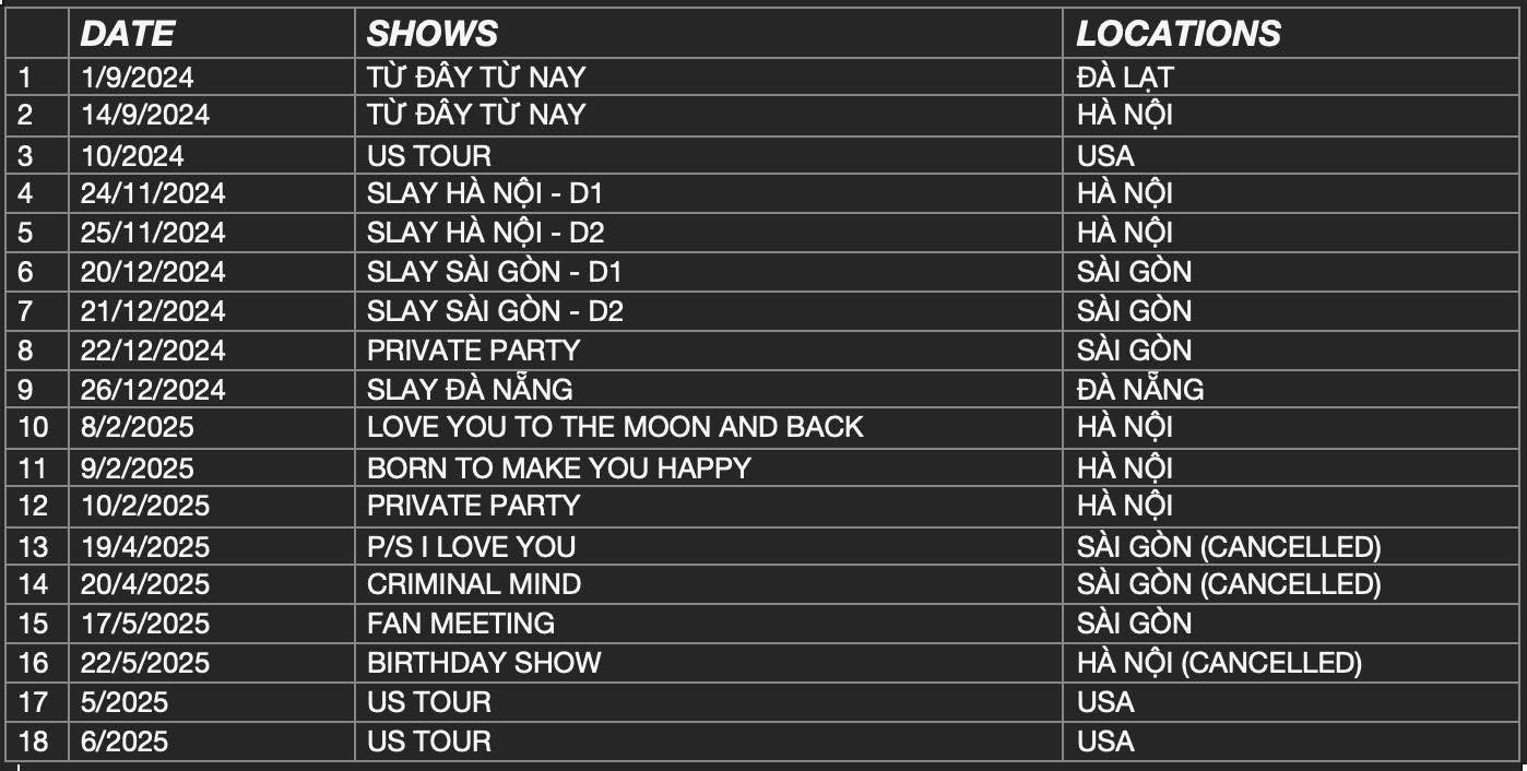 2. Lịch trình trên là của riêng V dành cho Tăng Phúc, không phản ánh toàn bộ lịch diễn của nghệ sĩ. Vì không đảm bảo tiến độ sản xuất, chúng tôi buộc phải canceled lịch 2 shows thang 4/2025. V cần công khai nhận trách nhiệm đã đơn phương canceled, để các đối tác, nhà tài trợ (đã gửi thông tin tài trợ nội bộ) và GSN được miễn trừ trách nhiệm liên đới. Phía GSN có thể bắt đầu nhận những shows diễn khác cho Tăng Phúc.