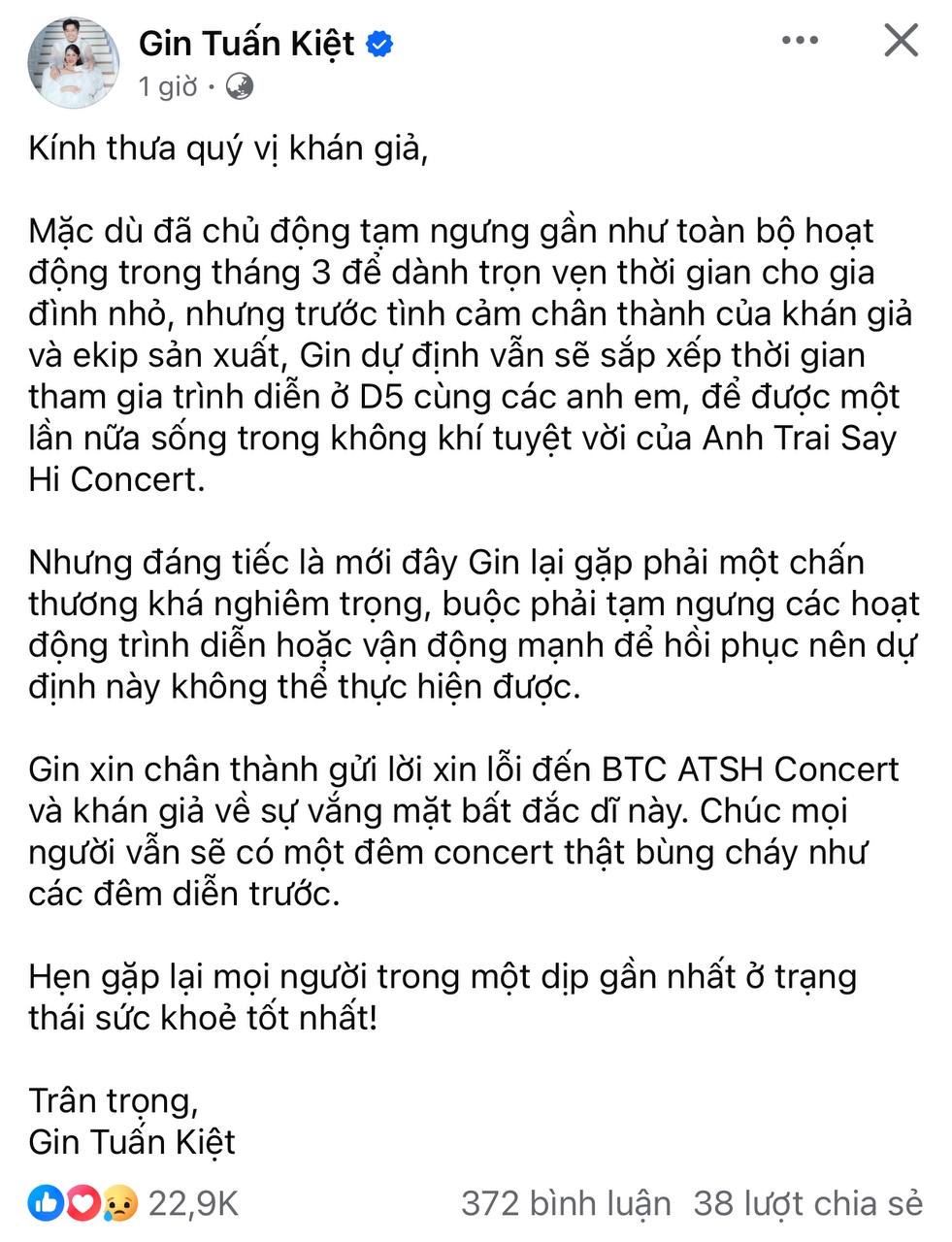Đến giữa tháng 3, Gin Tuấn Kiệt thông báo huỷ diễn ở concert Anh Trai Say Hi vì chấn thương nghiêm trọng. Tuy nhiên gây chú ý trong dòng trạng thái của nam ca sĩ có nhắc thêm "muốn dành thời gian cho việc ý nghĩa hơn thuộc về gia đình". Dù không nhắc tên cụ thể, chia sẻ này được cho là đang ngầm nói đến việc chào đón thành viên mới.