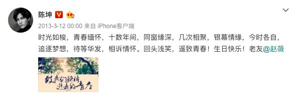 Đến tận khi Triệu Vy lần đầu thử vai trò đạo diễn trong bộ phim "Gửi tuổi thanh xuân" năm 2013, Trần Khôn mới giúp bạn mình tuyên truyền bộ phim và cũng không quên chúc sinh nhật cô nàng. Có thể nói, đây là lần đầu tiên nam diễn viên công khai chúc mừng sinh nhật bạn mình và đây cũng là lần cuối cùng đến thời điểm hiện tại.