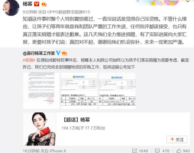 Sau khi thông tin nổ ra, Dương Mịch đăng tải 1 bài phản hồi và cho biết: "Khi tôi biết chuyện này đã rất bất ngờ và đau khổ, không lên tiếng là vì cảm thấy mình chẳng có tư cách nói chuyện. Dù là lý do gì thì việc để mấy đứa trẻ chờ đợi 2 năm cũng là lỗi của tôi và ekip, tất cả lời phê bình tôi đều chấp nhận, chỉ có thực sự quyên góp mới có thể bày tỏ lời xin lỗi".