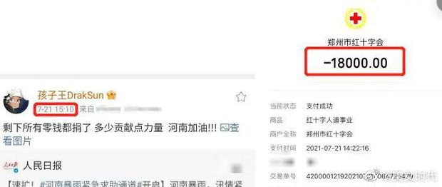 Trong trận mưa lũ tại tỉnh Hà Nam (Trung Quốc) tháng 7 vừa qua, trong khi cả làng giải trí dốc lòng quyên góp tiền từ thiện cho các nạn nhân hứng chịu thảm hoạ thì 1 nam ca sĩ sự nghiệp lẹt đẹt bất ngờ nổi như cồn trên MXH. DrakSun - 1 rapper sinh năm 1997 gây xôn xao vì hình ảnh tự mình photoshop sao kê thông báo chuyển khoản 18.000 tệ (63 triệu đồng) cho quỹ từ thiện), trong khi con số thật chỉ là 100 tệ (350.000 đồng).
