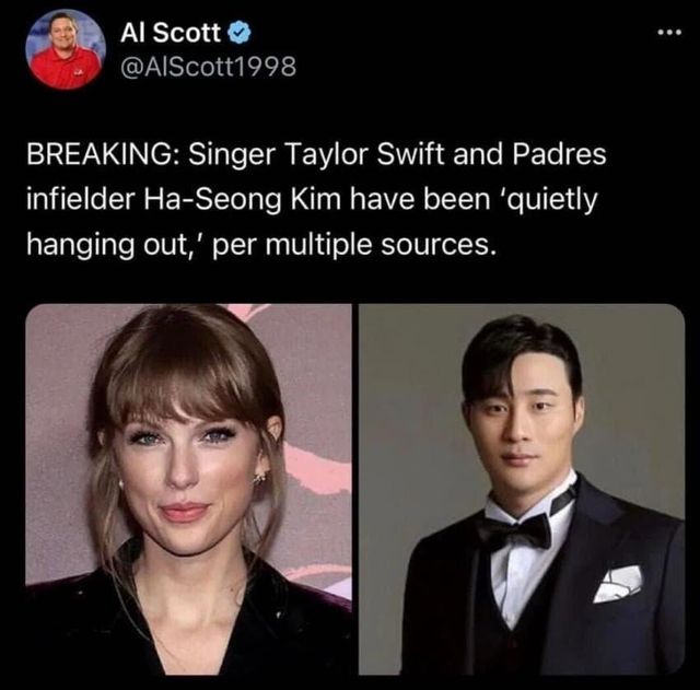 Vào hôm 15/9, nhà báo thể thao nổi tiếng Al Scott bất ngờ đăng lên dòng tweet có nội dung gây xôn xao: “ Cực nóng! Nhiều nguồn tin cho biết Taylor Swift và nam cầu thủ Kim Ha Seong của đội bóng chày San Diego Padres đã tận hưởng buổi đi chơi bình lặng ”.