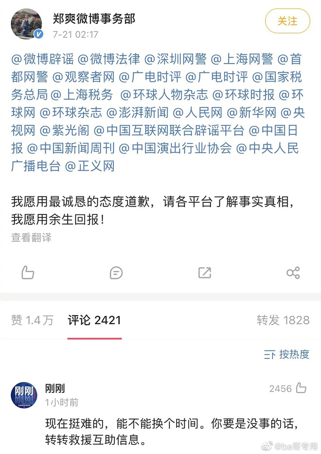 Tuy nhiên, Trịnh Sảng "điên cuồng" tag tất cả các tài khoản cơ quan báo chí, truyền thông lớn, chia sẻ bài viết của CCTV cùng lời tuyên bố chắc nịch: "Tôi sẽ nghiêm túc suy nghĩ, kiểm điểm lại bản thân, nỗ lực để mang lại những tác phẩm tốt hơn nữa báo đáp xã hội", "Tôi thành khẩn gửi lời xin lỗi, mong các nền tảng hiểu rõ chân tướng vụ việc, tôi nguyện dùng phần đời còn lại để báo đáp",...