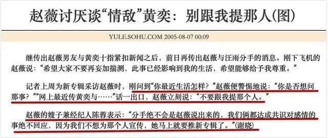 Triệu Vy và Huỳnh Dịch cùng đóng chung vai "Tiểu Yến Tử" nhưng mối quan hệ thù hận của họ lại không đến từ vai diễn này. Sau khi trở thành Ảnh hậu tại LHP Quốc tế Thượng Hải, Triệu Vy đã công khai hẹn hò với một trong "tứ thiếu Bắc Kinh" là Uông Vũ. Nhưng chuyện tình này kéo dài chưa được bao lâu thì kết thúc, sau đó Uông Vũ đã bị chụp lại hình nắm tay thân mật với Huỳnh Dịch trên phố.