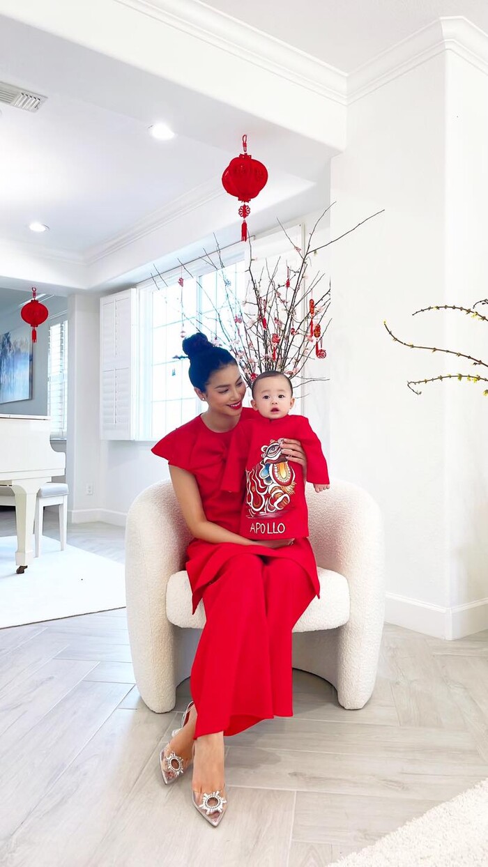 Mỹ nhân gốc Hải Phòng cùng 2 cậu ấm hẹn hò nhau diện sắc đỏ rực rỡ. Trong ảnh, khán giả nhận thấy Phạm Hương chăm chút cho gia đình mình rất gọn gàng và trang trí rất ấn tượng đúng với tông màu ngày Tết.