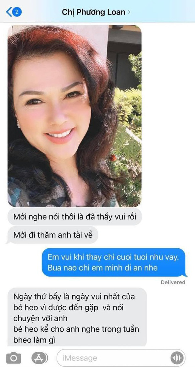 Vào sáng ngày 21/2, một người bạn đã hé lộ tin nhắn trò chuyện với ca sĩ Phương Loan gây chú ý vì một tình tiết. Sau gần 3 tháng ông xã gắn kết hơn 30 năm qua đời, ca sĩ Phương Loan tâm sự vẫn duy trì đến viếng cố NS Chí Tài vào cuối tuần. Hiện tại, ca sĩ Phương Loan đã nở nụ cười, lấy thần sắc cũng tốt hơn hẳn trước đó, cô tâm sự: "Mới đi thăm anh Tài về. Ngày thứ 7 là ngày vui nhất của bé Heo vì được đến gặp và nói chuyện với anh. Bé Heo kể cho anh nghe trong tuần qua bé Heo làm gì".