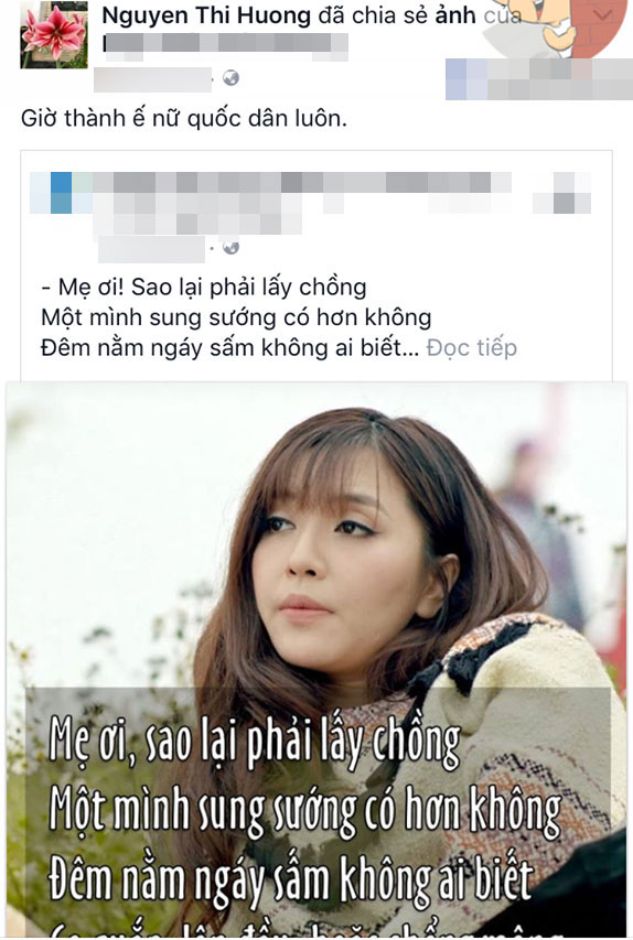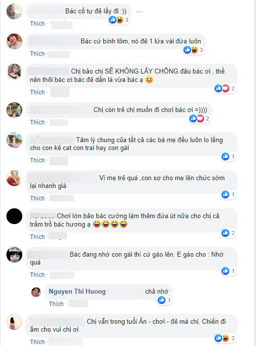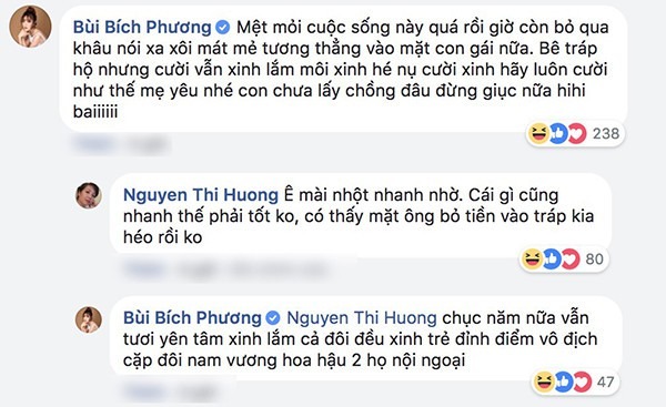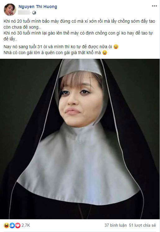 Mới đây, mẹ Bích Phương tiếp tục thu hút sự chú ý khi đăng ảnh chế con gái trong trang phục nữ tu cùng dòng chia sẻ hài hước: "Khi nó 20 tuổi mình bảo mày đừng có mà xí xớn rồi mà lấy chồng sớm đấy tao còn chưa đẻ xong.. Khi nó 30 tuổi mình lại gào lên thế mày có định chồng con gì không hay để tao tự đẻ lấy. Nay nó sang tuổi 31 rồi và mình thì không tự đẻ được nữa rồi. Nhà có con gái lớn à quên con gái già thật khổ mà".