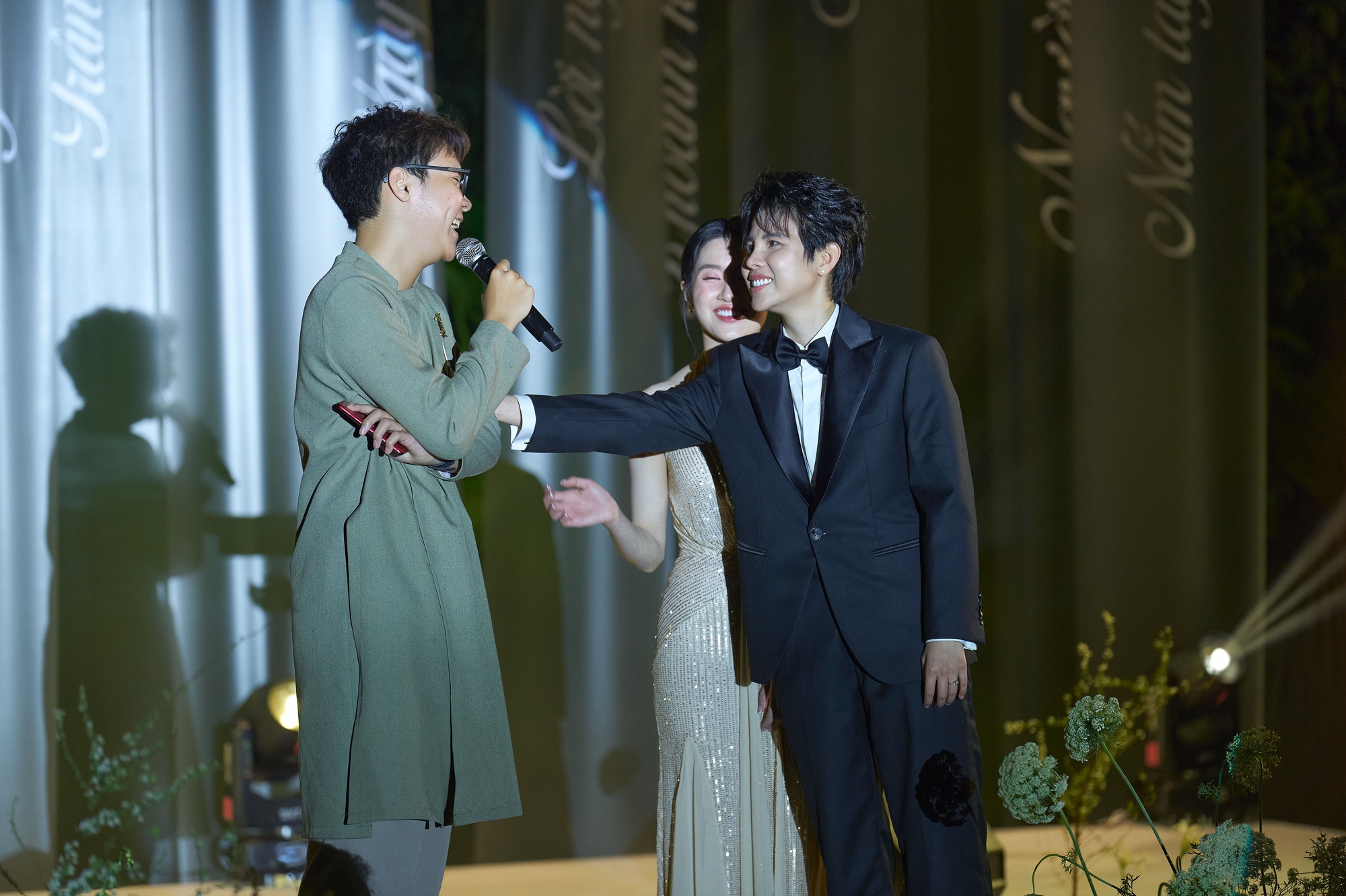 Bên cạnh đó, gây chú ý không kém chính là màn phát biểu 4 phút của em trai Vũ Cát Tường. Em trai giọng ca Từng Là mặc áo dài cách tân, chia sẻ cảm xúc về tình yêu của Vũ Cát Tường và Bí Đỏ. Anh chàng này cũng tranh thủ phơi bày tính cách của "Hai" (cách gọi của em trai với Vũ Cát Tường - PV) ở nhà và bày tỏ sự ngưỡng mộ trước tình cảm của chị dâu Bí Đỏ dành cho Hai nhà mình.
